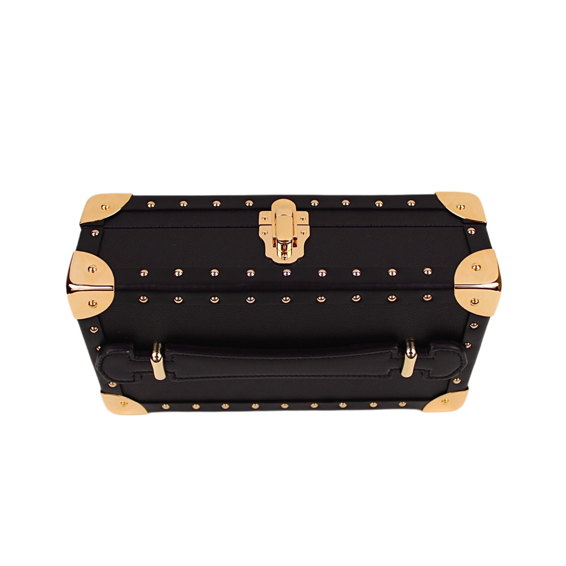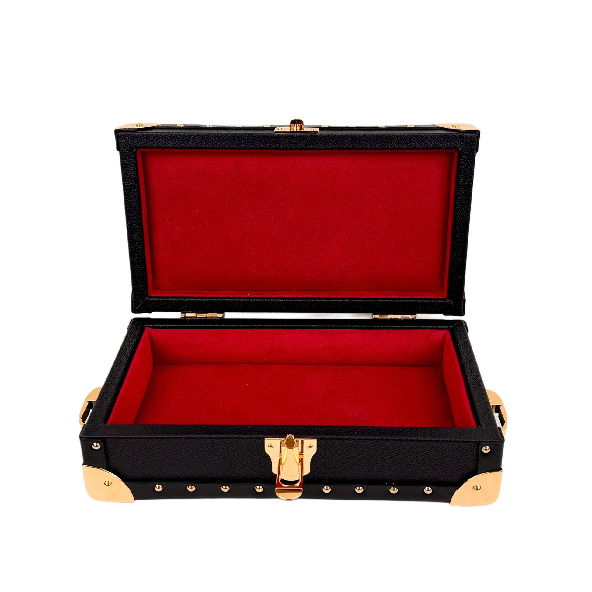 This mini leather trunk combines timeless craftsmanship with everyday practicality. Constructed from calf leather with solid brass hardware finished in gold, it features alcantara lining that protects your valuables. Compact enough to carry anywhere, yet substantial enough to make an impression; this is the same trunk Trax NYC relies on for his exclusive gold giveaways. Perfect for storing jewelry, collectibles, or anything worth keeping close.